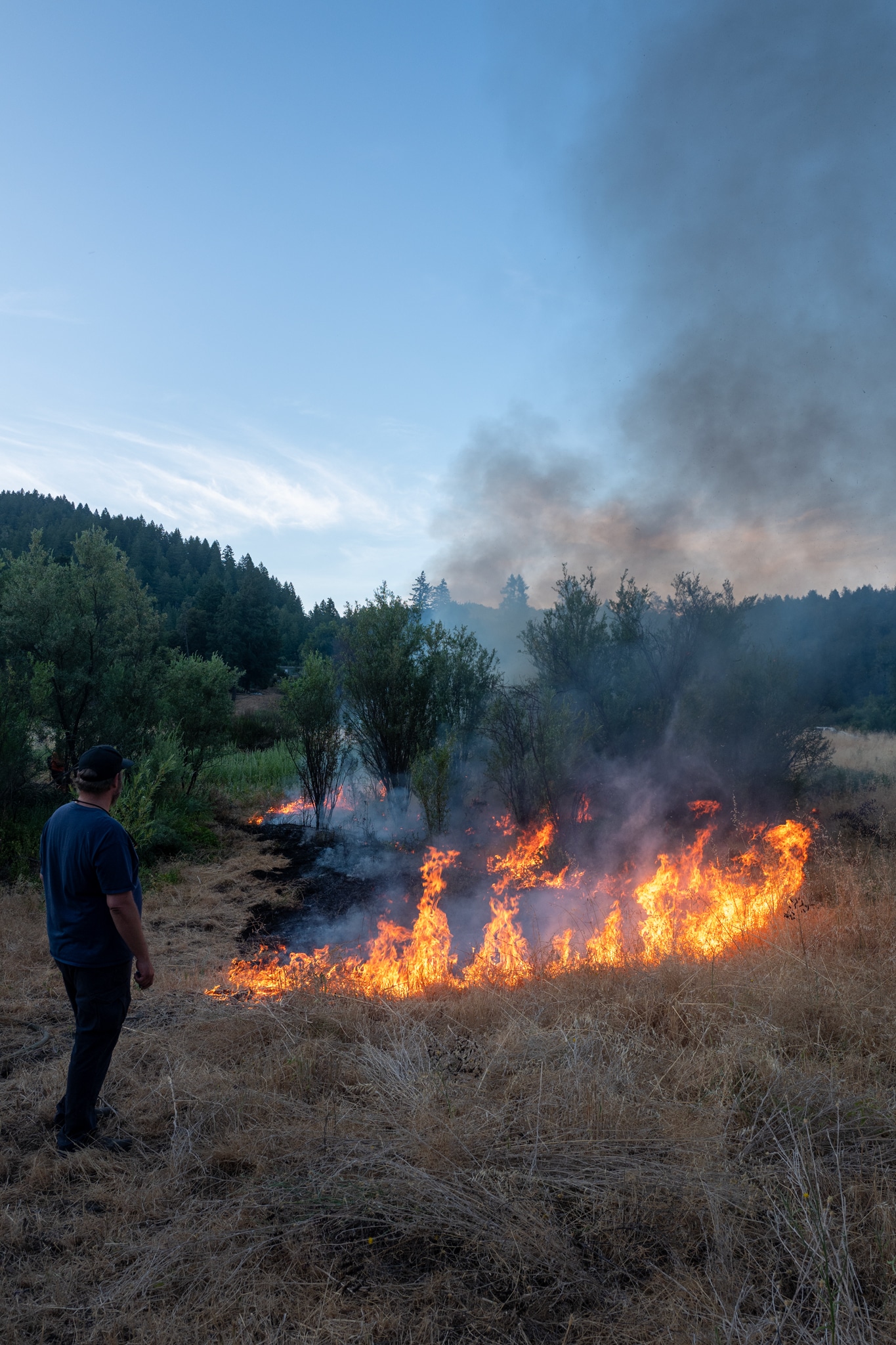 All Hands All Lands, a cooperation of tribal and civic organizations leading burns in the region, cleared out brush and set fires along the sloping hillside by the Klamath River. Staring at the blazes along Sandy Bar Ranch, her home and business, Blythe Reis said she feels protected when the temperature reaches 100 degrees and when lightning strikes come. “We’ve been doing controlled burns on our property for eight to 10 years now. It just makes you feel safer.”