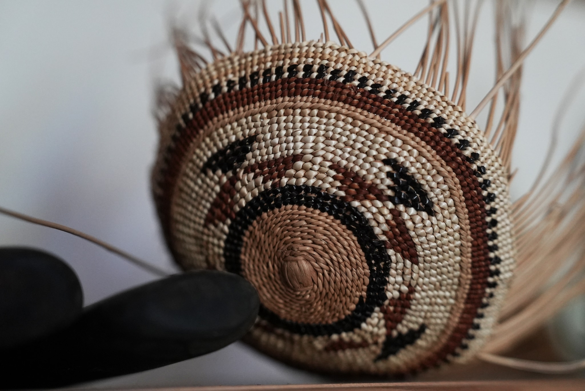 At her home, she showed us piles of hazelnut branches in her craft room lying in wait to be split and bound. Along her shelves are beaded necklaces, some for the flower dance ceremony, and smaller baskets she’s made. Robbins held up an incomplete one — a tight matrix of bright blond and dark material — that her late grandmother started but never completed. Maybe she’ll finish it one day, she said with a smile, placing it back.