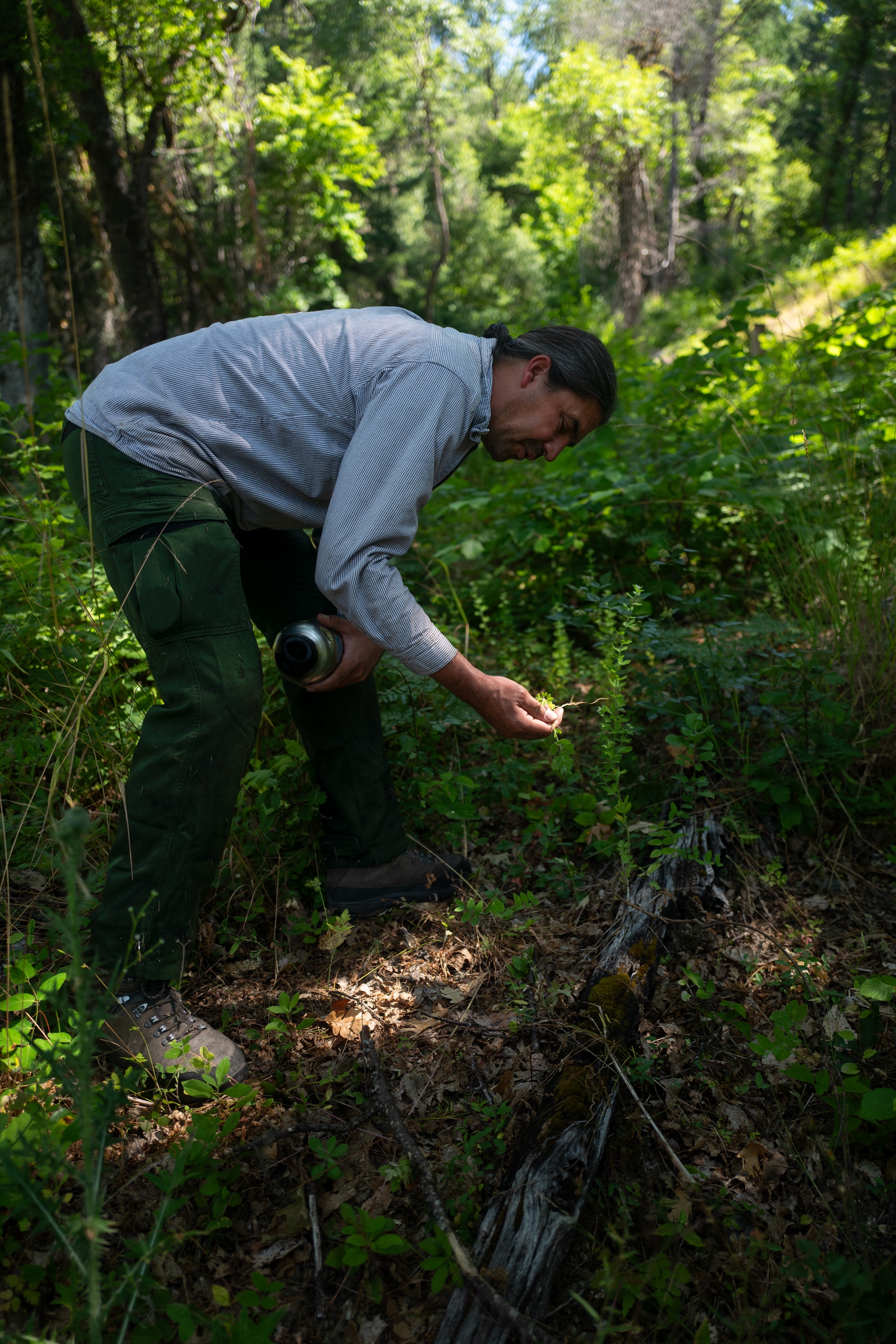 Robert peered into the hollow burn scar in a conifer, its dark corners now an animal’s storehouse for hazelnuts. Nearby, native potatoes and berries grew unabated. McConnell examined where someone had been harvesting branches for basket materials, concluding that it must have been recent. These resources are all made possible from burning here, he said, pausing to listen for the call of a variegated woodpecker.