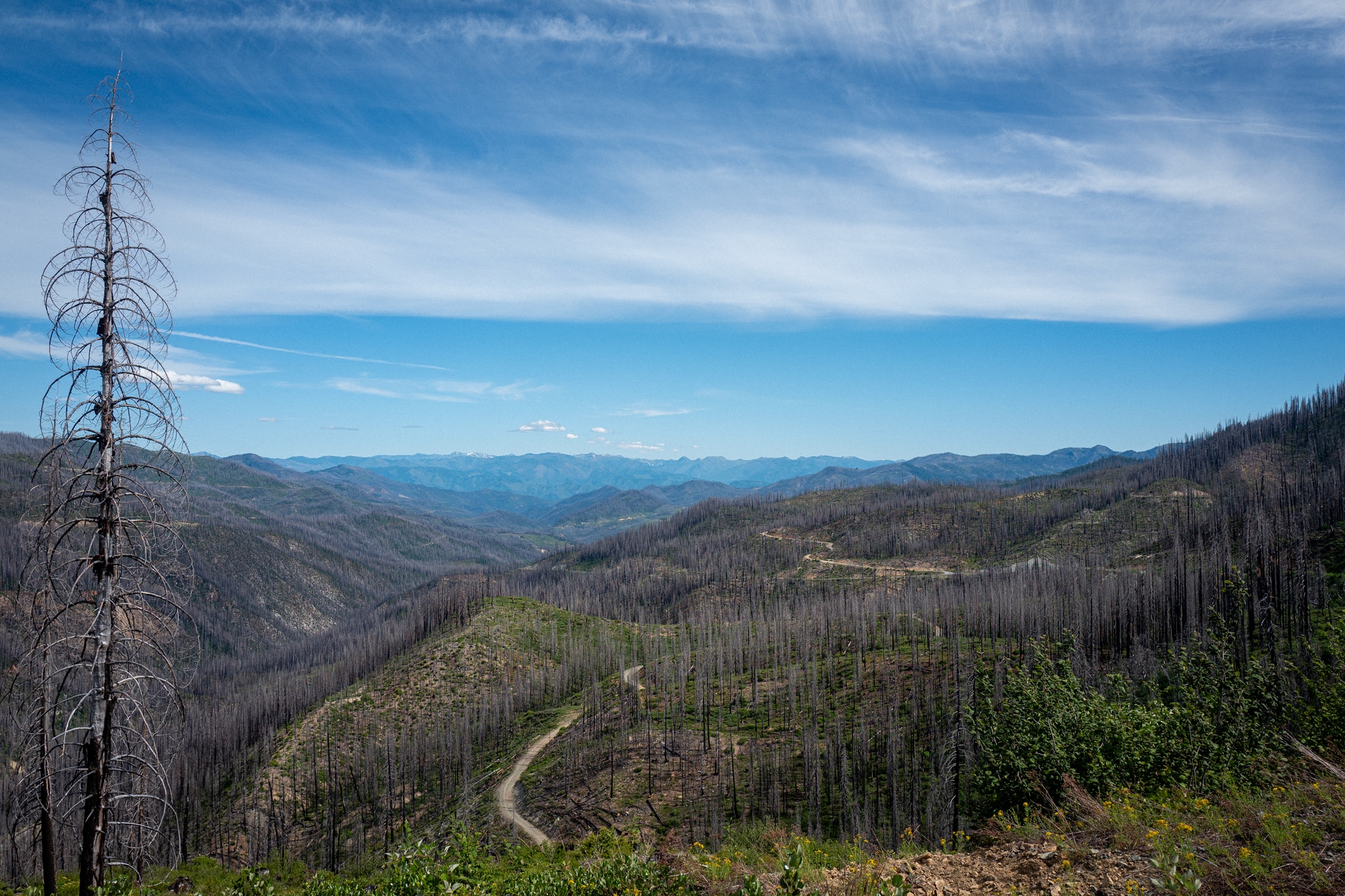 The next day, a few miles from the Oregon border, I found myself talking with a postal worker in the town of Happy Camp who suggested I drive some 40 minutes up the road to see the burn scar. Though it has been five years since the devastating Slater fire, the landscape feels as though fires tore through recently. There’s barely a sound, and wind sweeps freely through the matchstick remains of conifers.