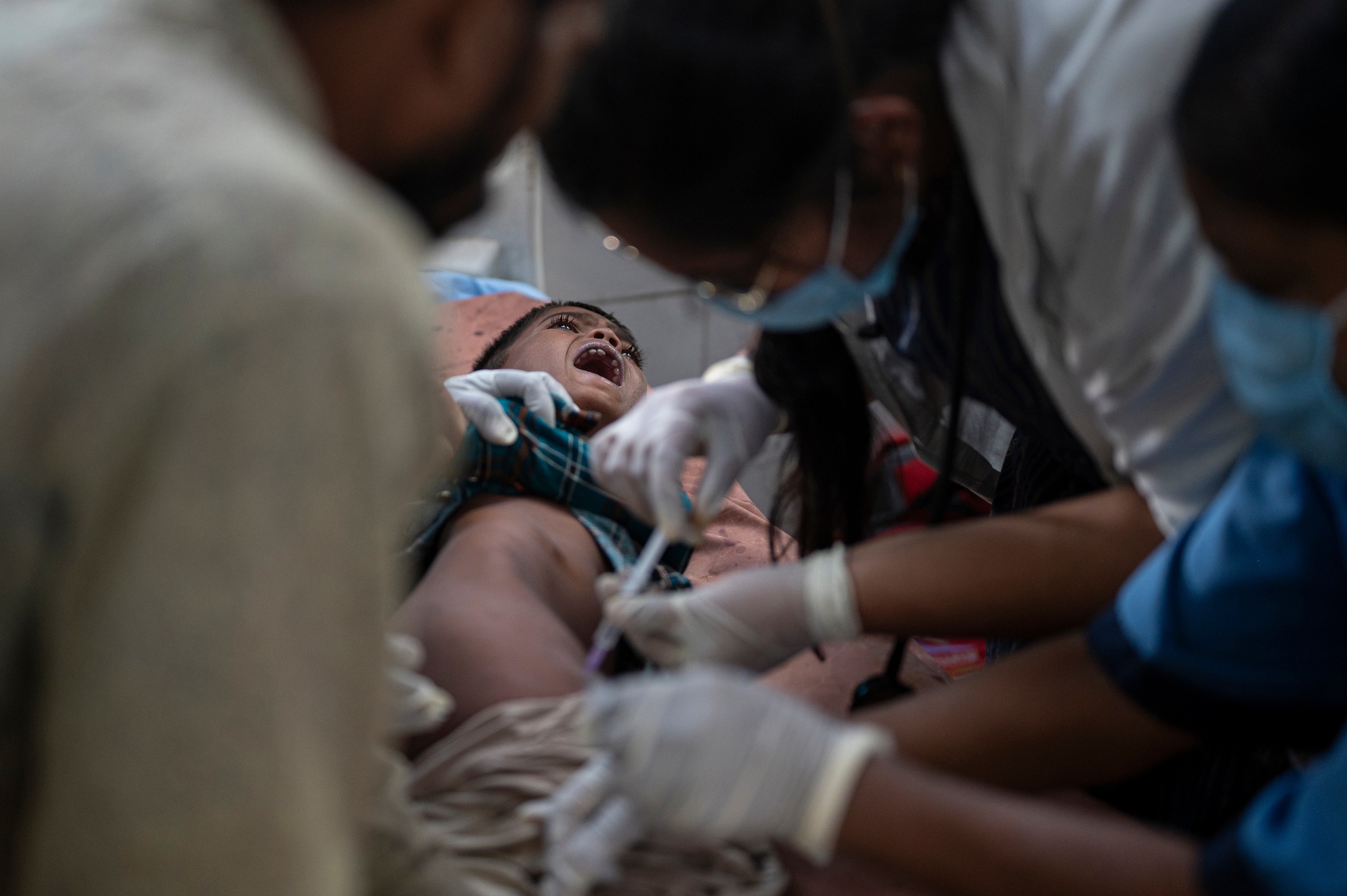Some 800 miles south of the dump, in the city of Hyderabad, a slender boy named Maniteja, 7, lies beneath a pink blanket, unresponsive, breathing through a ventilator. His dark eyes drift. For nine months, no words have come from his lips, only small cries. The family leaves a window open, hoping the sounds of friends playing outside will pierce the fog and restore him to consciousness.