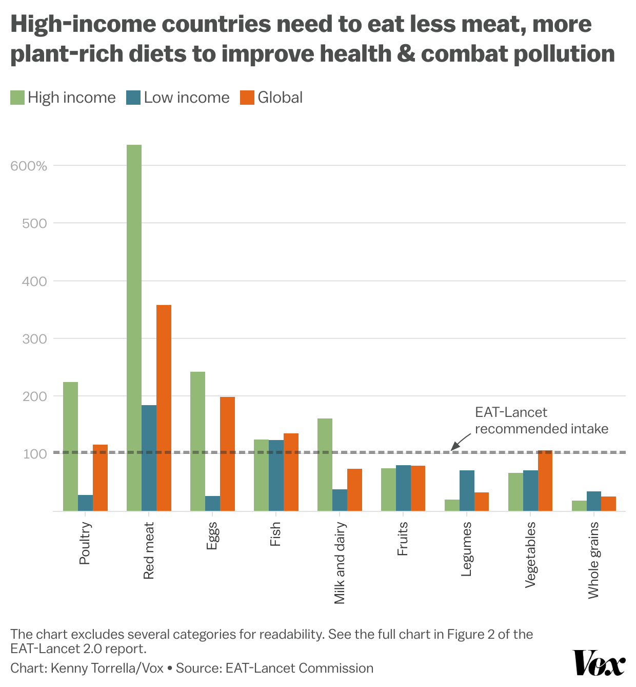 To set humanity on a healthier, more sustainable path, the commission recommends what they call the Planetary Health Diet, which consists of more whole grains, fruits, vegetables, legumes, and nuts than what most people in high- and upper-middle-income countries consume, along with less meat, dairy, and sugar. But in poor regions, like Sub-Saharan Africa and South Asia, the commission recommends an increase in most animal products, as well as a greater variety of plant-based foods.